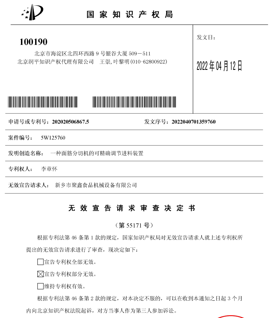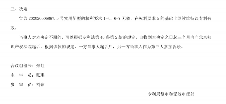 北京润平接到客户委托,指派专利代理师叶黎明和王崇仔细研究涉案专利,进行全方位的检索。在专利权评价报告已经认定涉案专利具有新颖性和创造性的条件下,检索到能够影响涉案专利的新颖性和创造性的关键证据,并最终依靠检索的证据以及专利答辩技巧,使得涉案专利中的7项权利要求中,6项权利要求被宣告无效,仅1项权利要求维持有效(该项权利要求对客户产品没有构成威胁)。况